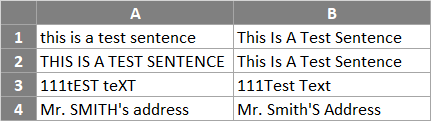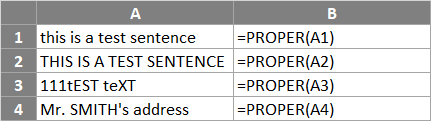 In the following spreadsheet, the Excel Proper function is used to convert four text strings to proper case: