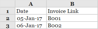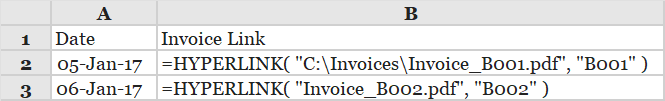 As the current spreadsheet is located in the directory C:\Invoices, the hyperlink functions in cells B2 and B3, create links to the files Invoice_B001.pdf and Invoice_B002.pdf, both of which are located in the directory C:\Invoices.